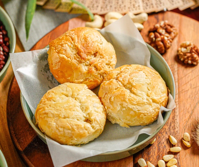 因为起酥恰到好处,酥层均匀清晰,每一层都可以撕下来,轻轻一捏或轻咬一口,酥皮都会簌簌掉落。层层叠叠的酥皮包裹着馅料,即使出炉后摆上一天,不必加热,吃口依然酥松爽脆。