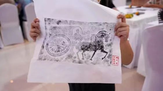 除了古砖月饼DIY,现场还可体验汉代车马图古砖拓片,拍打按压之间,车、马、人物的动态流畅感在宣纸上展现得淋漓尽致。“第一次接触拓片艺术,先将宣纸打湿,再用小布蘸上墨汁在宣纸上轻轻地按压,既轻松又解压,最后盖上印章的那一刻特别有仪式感。”体验者陈熠珺说。