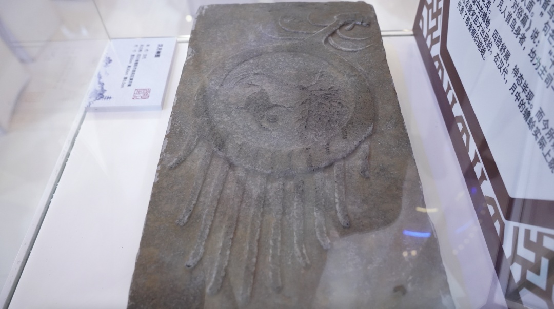 现场,印有汉代月神图的画像砖也在当天的字砖城市考古展上展出。透过玻璃橱窗,仍能感受到砖身的古朴敦厚,砖上的画像主体为人首鸟身,细长的脖颈上有五根羽毛,体腹呈圆月的形状,内部有桂树、蟾蜍,右边则是十根长短不一的尾羽,线条流畅、纹饰精妙。