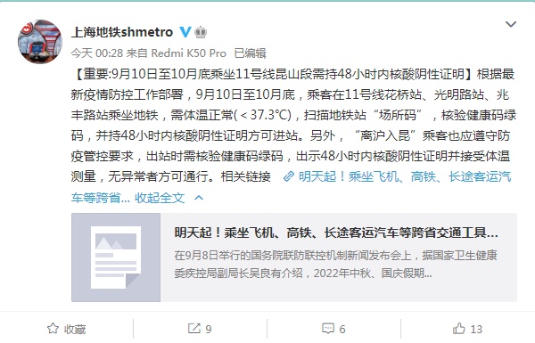 上海地铁消息,根据最新疫情防控工作部署,9月10日至10月底,乘客在11号线花桥站、光明路站、兆丰路站乘坐地铁,需体温正常(<37.3℃),扫描地铁站“场所码”,核验健康码绿码,并持48小时内核酸阴性证明方可进站。