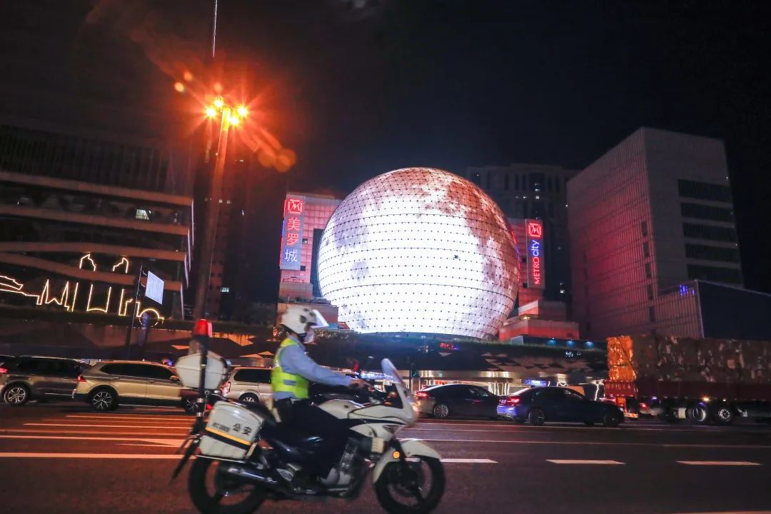 在徐家汇空中连廊上,美罗城外的3D裸眼球形屏幕“升起一轮明月”,引来不少群众驻足拍照。“来,当心,别人拍照,小朋友不要撞上了,拍完的也赶紧走起来了。”徐家汇派出所民警在天桥处加强巡查,提醒孩子家长和拍照的群众注意安全。