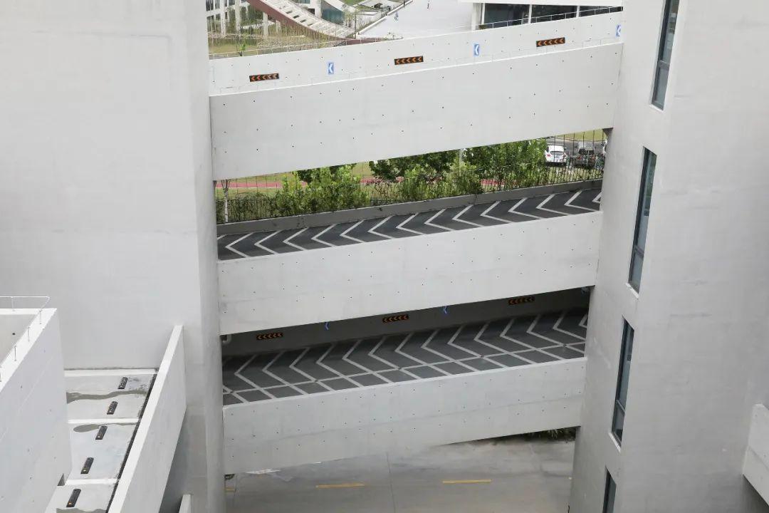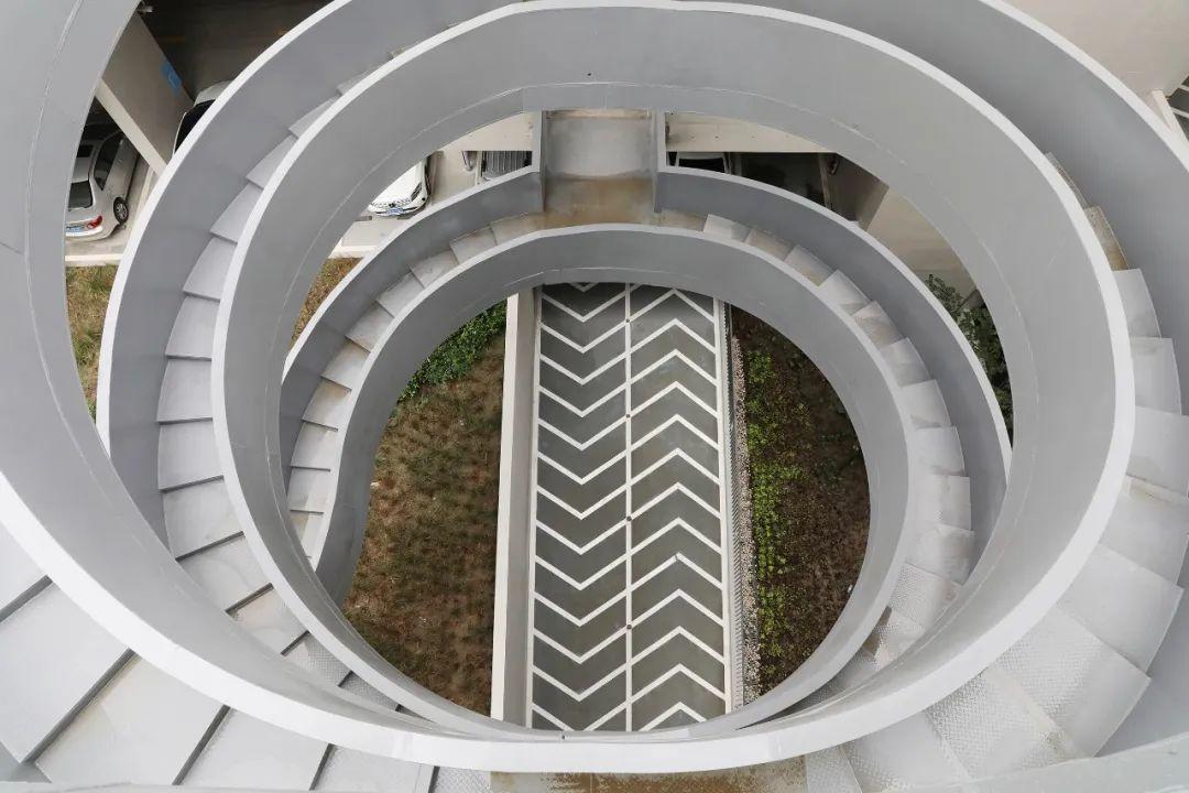 从顶层看,建筑的线条感充分显现,除了笔直的行车道,中央的螺旋式楼梯更是设计感十足,市民既可以乘坐电梯,也可以选择走楼梯,感受立体停车库的设计之美。