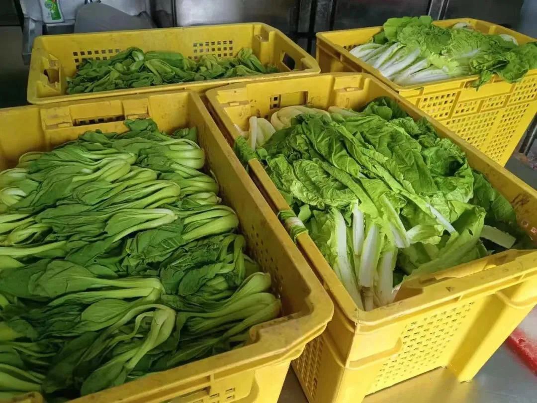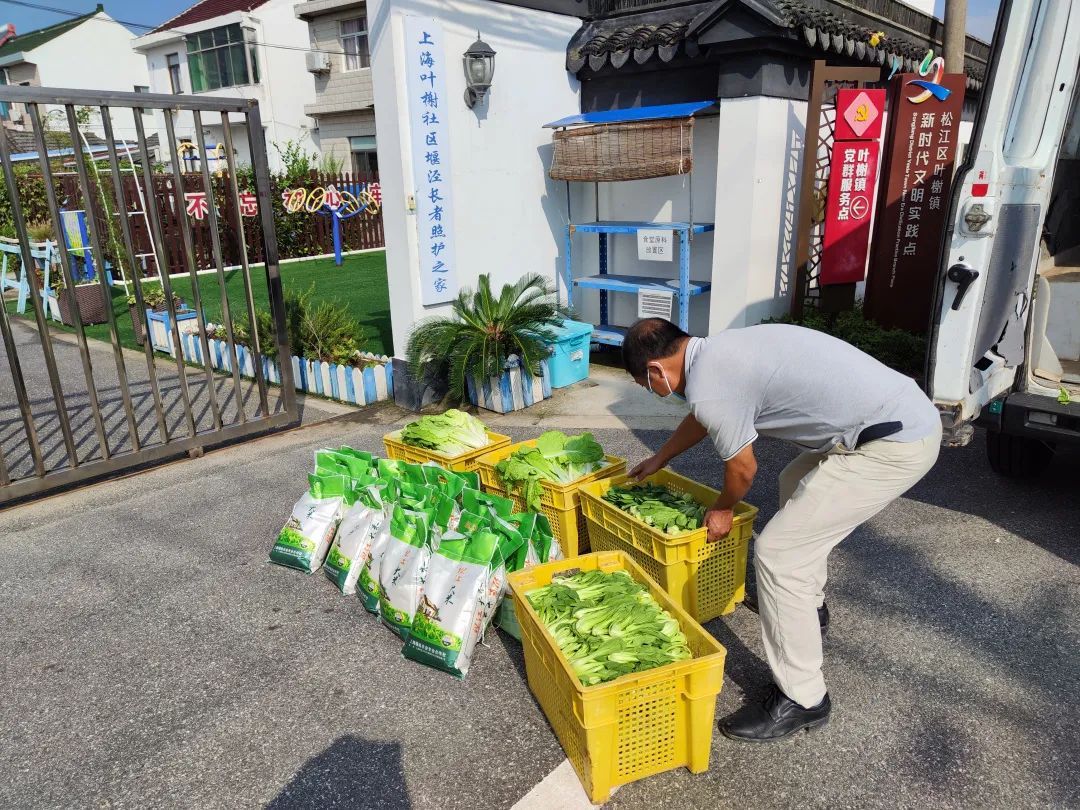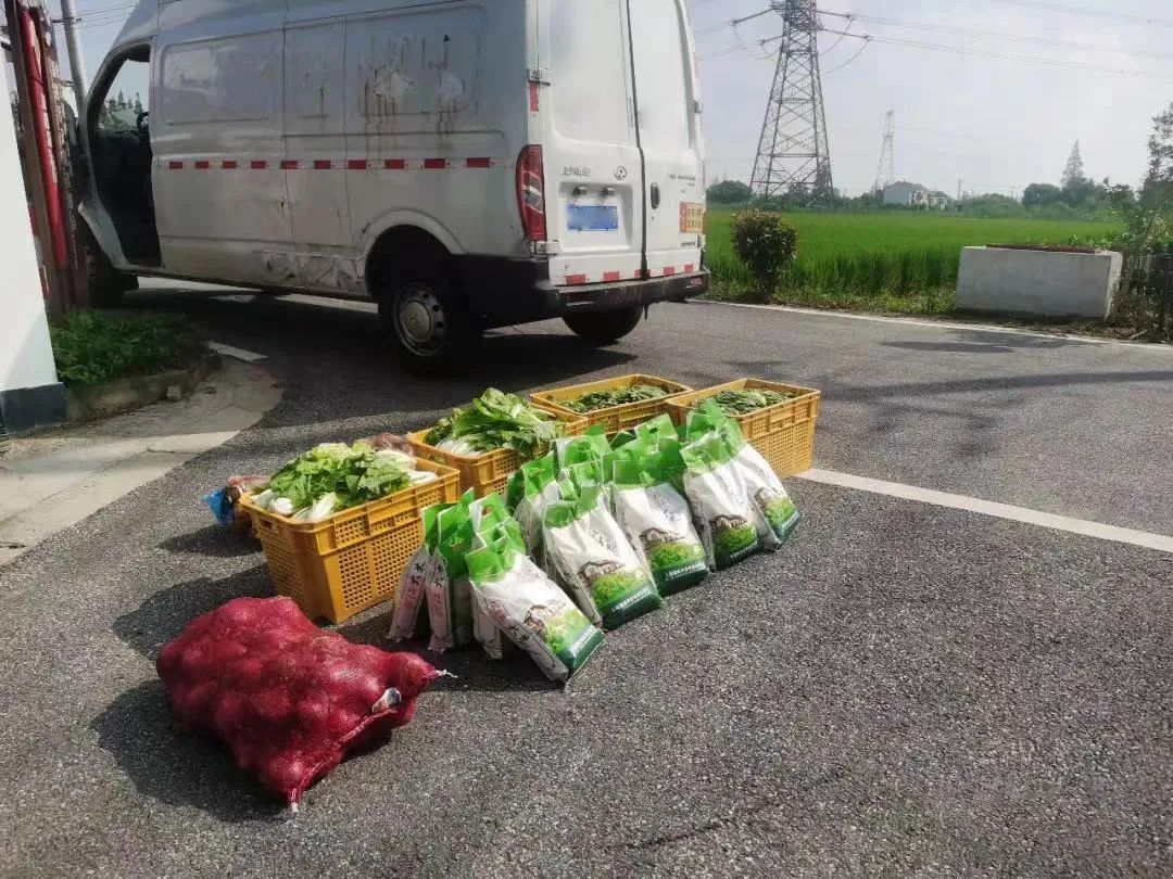 陆师傅把一袋袋新米、一筐筐蔬菜从车上搬下来,整齐地摆放在幸福老人村门口。由于疫情防控,采取了无接触配送。除了送新米,合作社还贴心地为老人送上今早新鲜采摘的几大筐绿叶菜、土豆、洋葱等蔬菜,丰富老人的餐桌。
