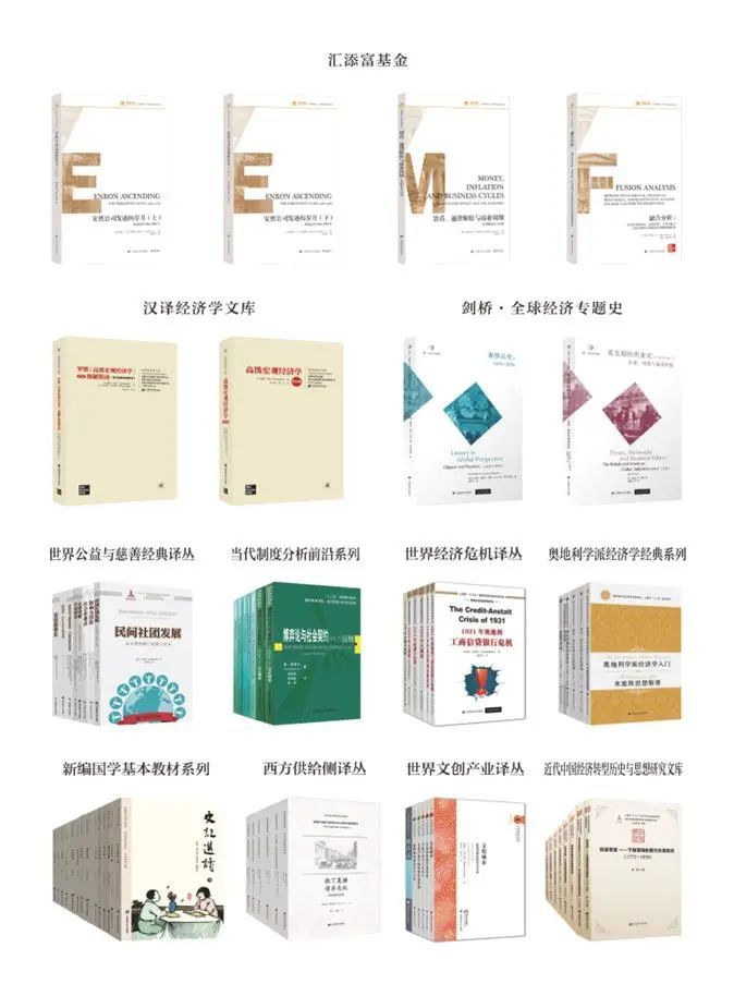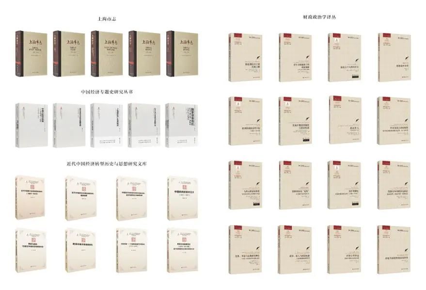 经过多年的建设,目前中心已出版了大量高端学术著作,主要包括原创和引进两类。在原创方面有:《1917-1919:马克思主义经济学在中国的传播启蒙》、“中国经济发展史(公元前16世纪至2019年)”、“近代中国经济转型的历史与思想研究”、“上海地方志”(经济部类2)、“中国经济专题史丛书”、“中国产业新体系、新模式、新动能研究丛书”、“当代中国经济实证分析丛书”、“当代中国创新创业前沿丛书”、“匡时学术文库”、《田国强学术文集》等;在引进方面有:“马克思主义政治经济学译丛”、“国家与社会治理现代化译丛”、“诺贝尔经济学奖获得者文库”、“财政政治学译丛”、“汉译经济学文库”、“世界公益与慈善经典译丛”、“当代世界文化创意产业经典译丛”、“世界经济危机研究译丛”、“人类经济社会思想探索前沿译丛”、“西方供给侧经济学经典译丛”、“贸易•政治•全球化译丛”、“世界资本经典译丛”等。这些图书中有不少被列入“十三五“国家重点出版物规划、”十四五“国家重点出版物规划,以及上海市”十三五“重点出版物规划和上海市”十四五“重点出版物规划,并且还有一些图书由于选题质量较高而被国家出版基金和上海市各级基金资助。