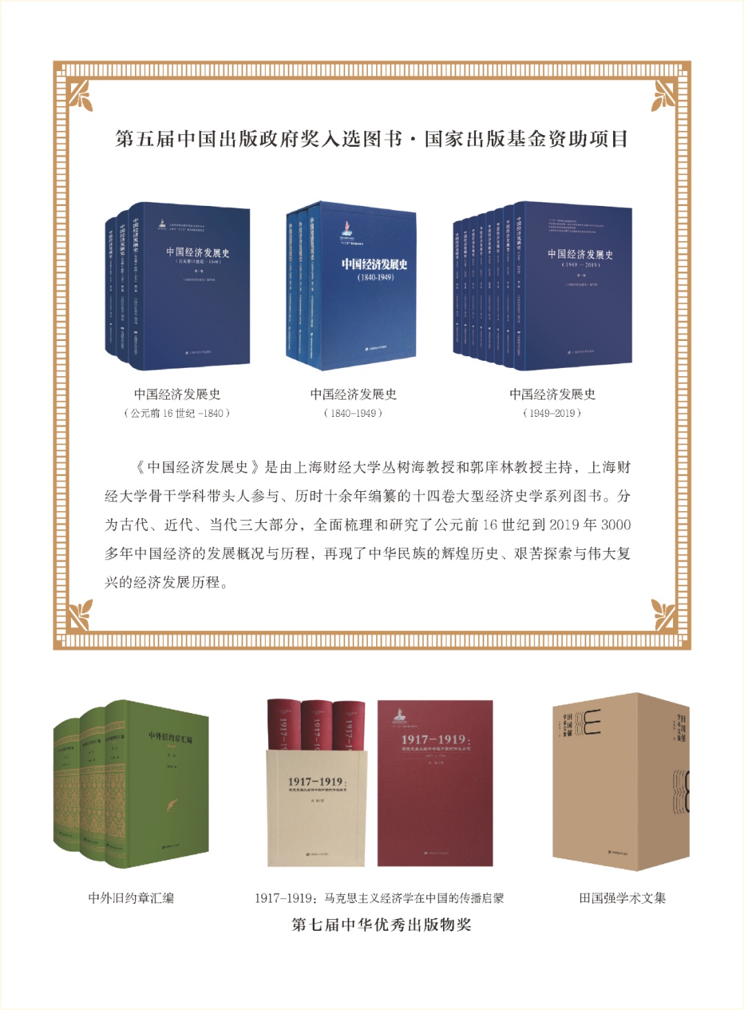 中心成立之后,上海财经大学出版社学术品牌图书的知名度和影响力进一步增强,品牌效应将不断凸显,从而获得了很多荣誉。例如,《1917-1919:马克思主义经济学在中国的传播启蒙》一书获得中华优秀出版物奖、上海图书奖一等奖;《中国经济发展史(公元前16 世纪至2019 年)》获得了第五届中国出版政府奖和上海图书奖荣誉奖;“诺贝尔经济学奖获得者文库”和《中外旧约章汇编》获得了上海图书奖二等奖;《中国经济发展史(1840-1949)》获得上海市第十四届哲学社会科学优秀成果奖学科学术奖一等奖。由此可见,中心的成立和建设对于提升出版社的品牌影响力和核心竞争力具有重要作用。