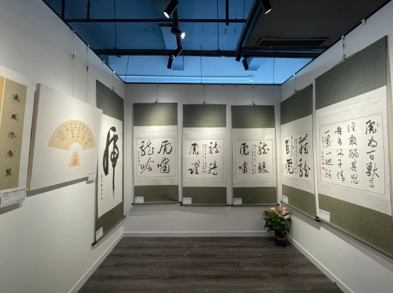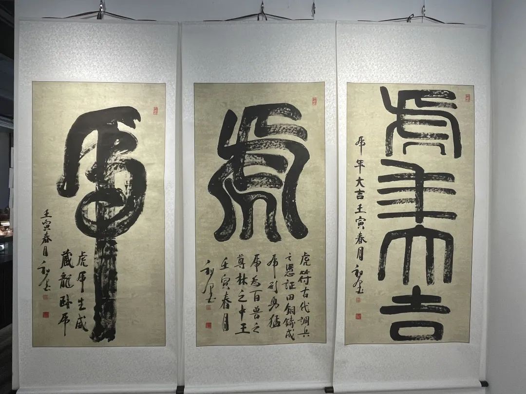 走进书法区域,可以看到有描写虎的诗词与成语,无论真草隶篆,均列阵成势,笔力遒劲。艺术家还融合了中西特色,在排版上进行了创新。几幅四尺斗方引起了记者注意,一幅书法作品融合了三种风格,右边用新魏体书写对联,中间用朱墨写“虎”,左边用小楷书写诗词,作品看着生动,富有创意。书法家陈智云告诉记者,书法写意不仅要做到保留传统,也要有新颖的意识,因此在排版中会注重创新。