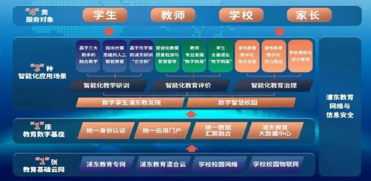 浦东新区教育总督学丁黎忠在直播中介绍,新区在教育数字化转型发展新理念和新目标的指引下,着力构建教育数字化转型的“1134”体系:包括构建“1”张教育基础云网;组成“1”座教育数字基座;建设智能化教学研训、智能化教育评价、智能化教育治理这“3”种区域智慧教育应用场景,以及完善网络与信息安全保障体系,致力于为学生、教师、学校、家长这“4”类对象提供服务。