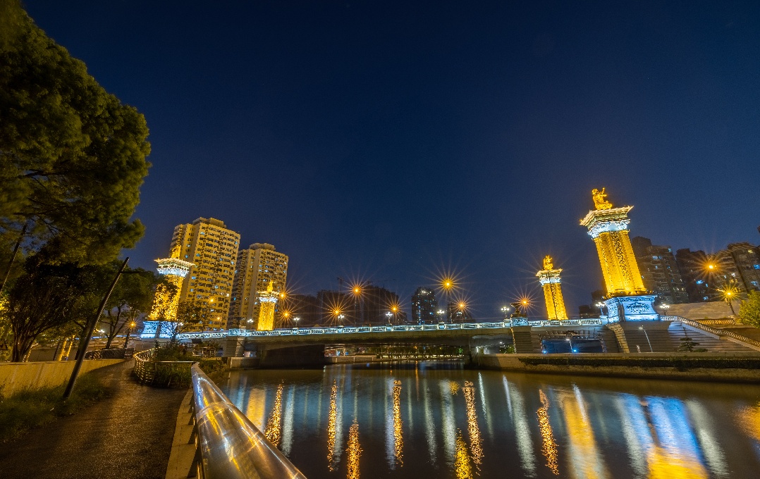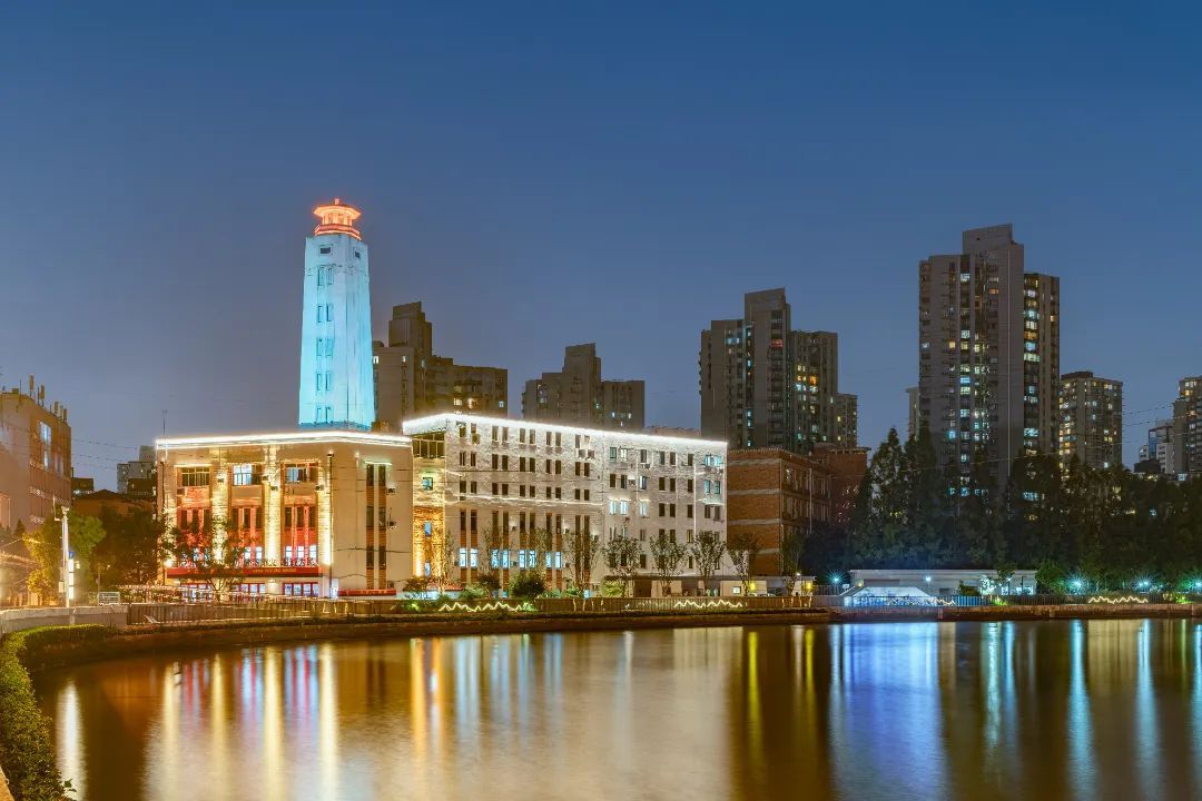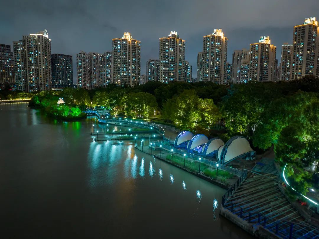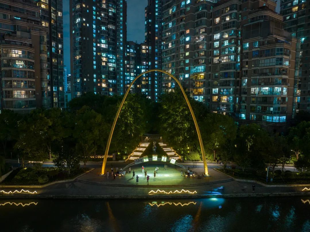 普陀半马苏河流域曲折、底蕴深厚,景观照明以“蓝绿空间·品质普陀”为主题,对堤岸、滨水空间、第一立面滨水建筑等进行提升,打造更加宜人的滨河夜景,通过光影重新演绎“湾”的故事。