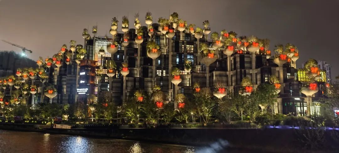 长寿湾,即见网红景点天安千树,顶部由1000根错落有致的长方形柱体组成,承载着1000多棵生长于中国山岳之间树木的“悬浮森林”,令人过目难忘。