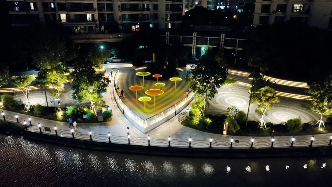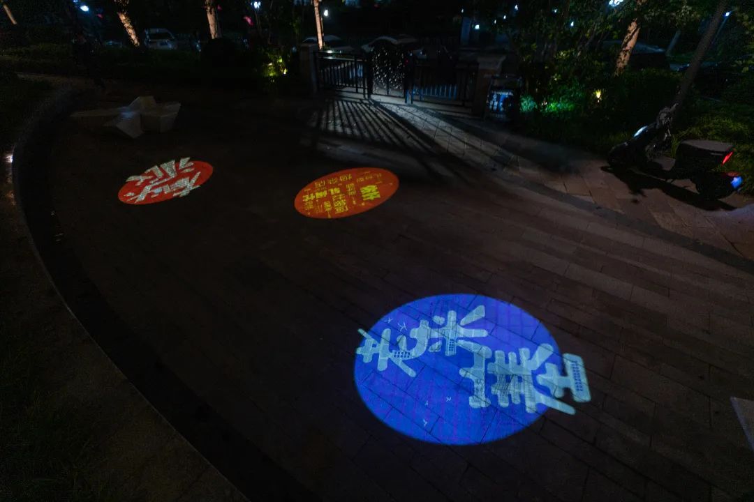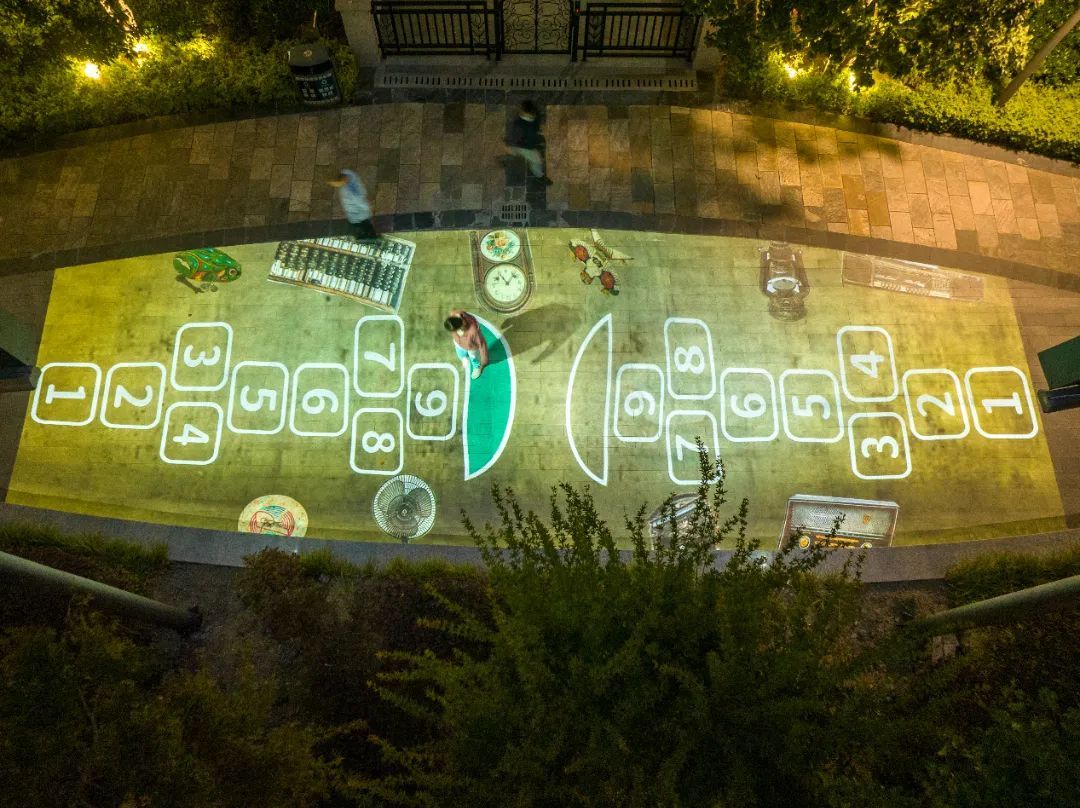 绕过朱家湾,沿南岸步行向着小花园湾,则是处处充满童趣的互动岸线,除了草丛里的投光灯将树冠打亮以外,每一处节点都设置了互动投影。充满童年回忆的“跳房子”吸引着大小朋友们欢快地跳跃,而再行几步,则是“苏河沪语”节点,生动的上海话文字在地面缓缓转动,在吸引孩子们的同时,沪语文化也在这一刻得到了传承。