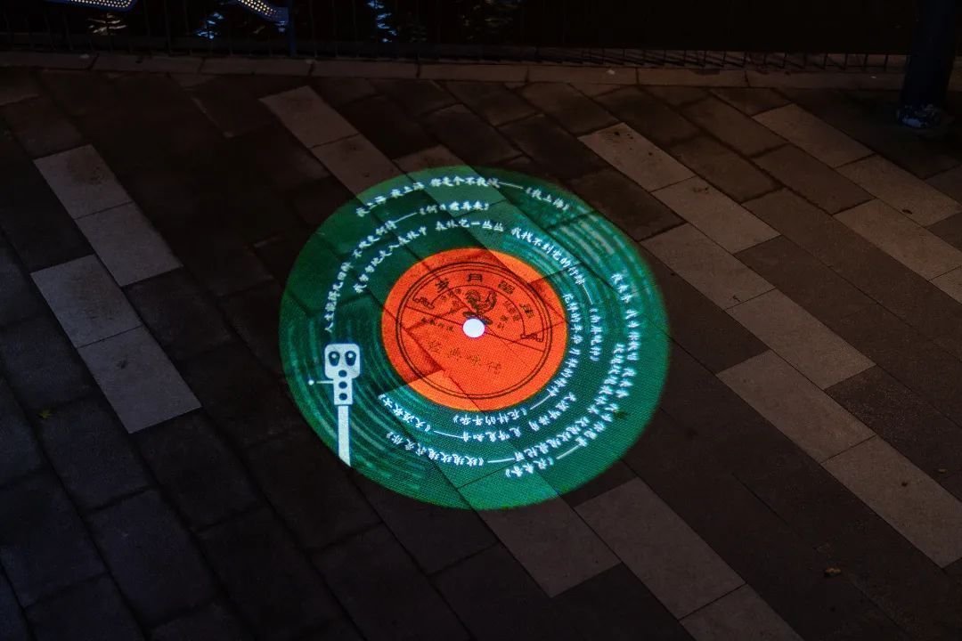 穿过西康路桥,绕过小花园湾,则进入到幸福生活岸线,新增的投光灯默默打亮树冠,照亮“舞台”。临着宝成桥下南岸,设置了“老唱片广场”,数个投影灯将“老唱片”投射在地面,各色唱片缓缓旋转播放,对应的老上海唱腔缓缓响起。