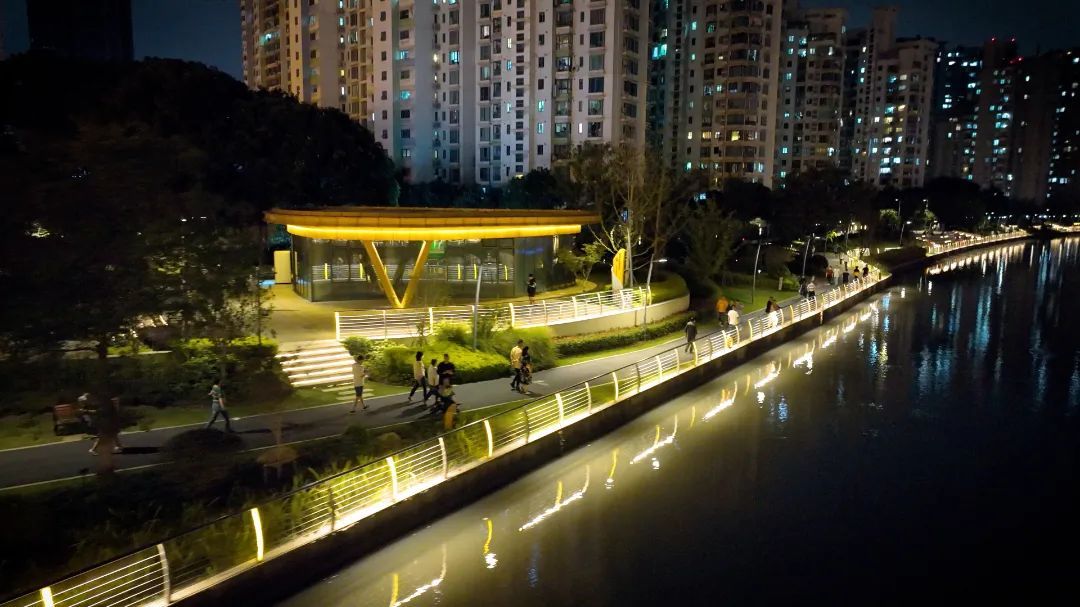 穿过昌化路桥向西,便是中远两湾城滨水步道。此次改造将原本彩色的岸线栏杆灯替换成了3000K的暖色光,变得更加温暖,光影变得柔和内敛。