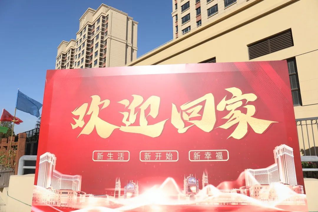 醒目的“欢迎回家”红色展板前