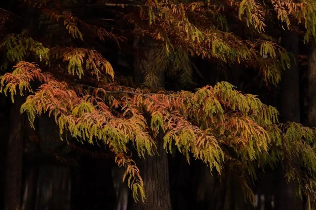 今年的秋天来的比较晚,虽然已是11月中旬,但公园里的杉林依旧郁郁葱葱,但有几棵杉树已经耐不住降温,正在悄悄变红,层层叠叠的绿中夹杂着红一片黄一片的叶子,像一小簇一小簇火焰,正在向四周蔓延。