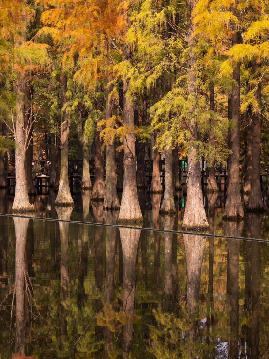 这片如画般的水杉林,水面清澈见底,就如同天庭遗落人间的一面水镜,平静而又深沉。它将所有的一切都映在了自己的身上,偶尔会有微风拂过,水面泛起阵阵涟漪,树影斑驳摇曳,没过一会儿又再恢复平静,再现如画般的水上秘境。
