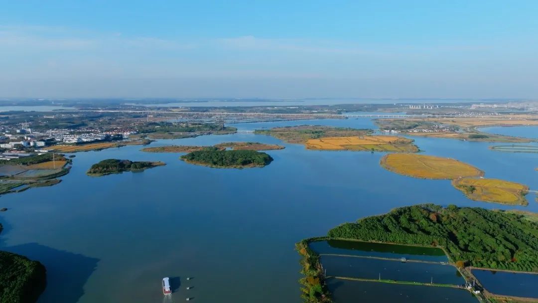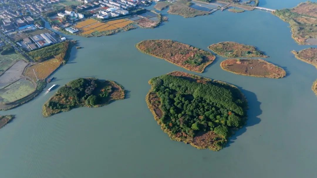 船缓缓驶向深处,眼前几个小岛颇具生趣,当地人称它为“梅花岛”,从高空俯瞰,五个恰似花瓣般的小岛散落一处,形似梅花,故此得名。“这里从未开发过,目前还是‘与世隔绝’的状态,但这里是小动物的天堂,岛上还发现了一些由村子里游上岛的刺猬、黄鼠狼。”说到动人处,区水务局局长不禁吟诗,“‘日落江湖白,潮来天地青’,这片水域相较其他,更显悠远、静谧……”据统计,蓝色珠链水域有水生高等植物17种,鱼类34种,其中还有比较名贵的刀鲚,还吸引了“鸟中活化石”震旦鸦雀等183种鸟类在此安家落户。