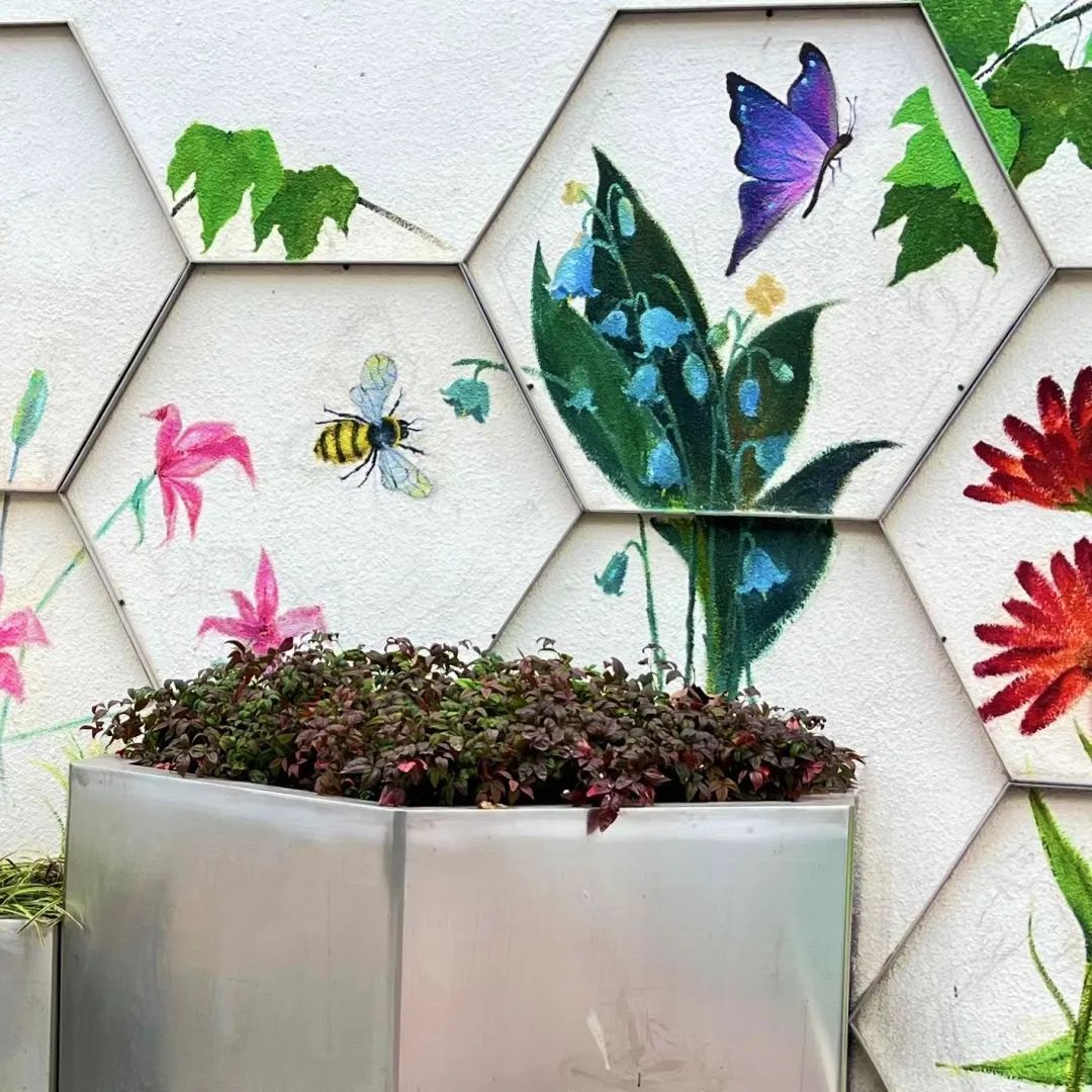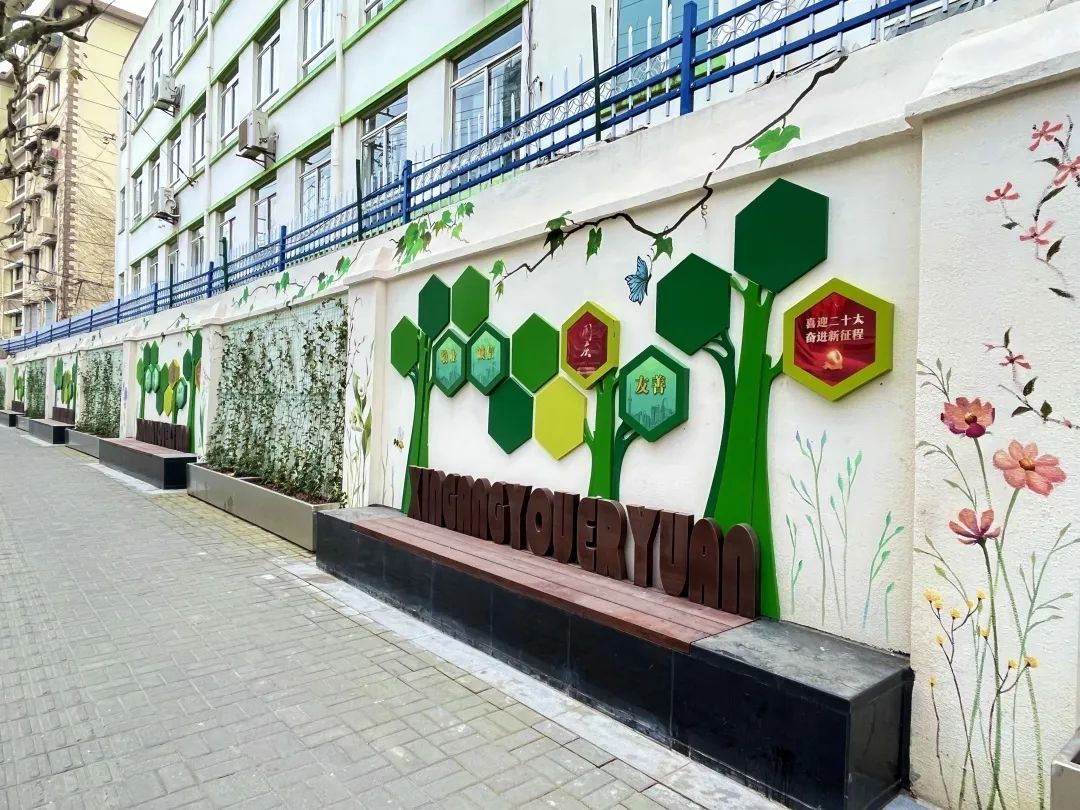 冬日暖阳下,蜜蜂蝴蝶飞舞花间……在新港路南侧的新港路幼儿园围墙上,彩绘了各种栩栩如生的花卉和小昆虫,赋予冬日童话般的梦幻色彩。