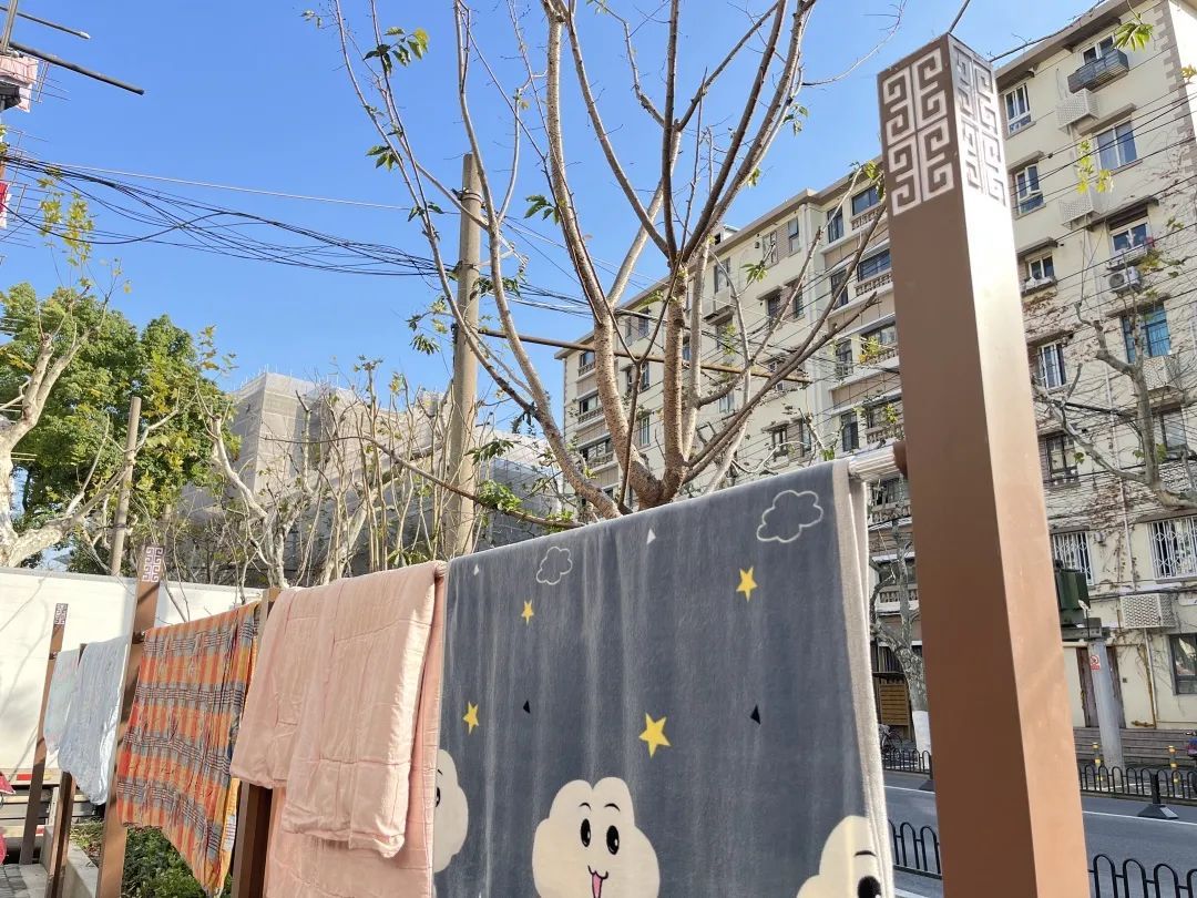 此次美丽街区改造,在沿街面新设了特色灯柱,灯柱间的不锈钢横杆成为实用的晾衣杆,满足居民日常晾晒需求。