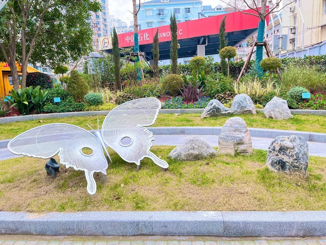 而新港路天宝路路口的绿地内新辟出一条小径,不仅提升了绿化景观,也缓解了此处人行道狭窄不便通行的问题,绿地内的蝴蝶雕塑成了街区环境“蝶变”的写照。