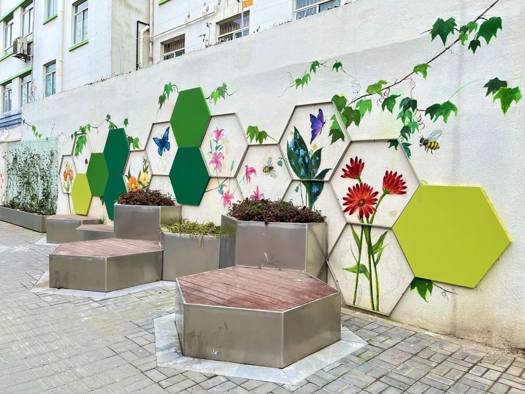为提供充足的休憩空间,沿墙不仅设置了常规的长条形坐凳,还布置了六边形组合坐凳,其高处是花箱,矮处是宽大的坐凳,小朋友们可在大人陪护下尽情攀爬玩耍。