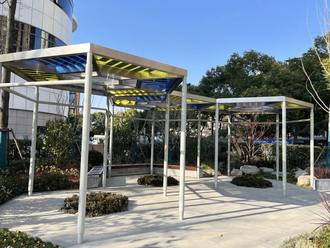 据介绍,此次美丽街区改造融入了不少科技时尚元素。畅心园内的廊架更是内藏“玄机”,其顶部有LED太阳能储能液晶屏幕,向游客展示着虹口的百年巨变,通过有效利用清洁能源,践行可持续生态发展理念。