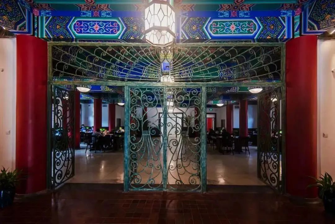 建筑大堂屋顶彩绘,部分彩绘是原件,其他彩绘按原件复制;红缸砖地面的上千片地砖从20世纪30年代保留至今;二楼中厅的“孔雀门”,门扇上是两两相对的孔雀造型,上方是一只开屏的孔雀,样式精美,铸铁件全部用铆钉连接;门楼为歇山二重檐形式,楼顶用明黄琉璃瓦覆盖,附以华丽檐饰,四周平台围上石栏杆,非常气派。