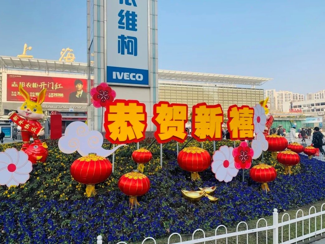 冬季上新的观赏花卉红红火火,传统春节装饰年味十足,在下个路口转角,说不定就有一只手举“福”字春联的卡通小兔子为市民游客送上新年祝福。
