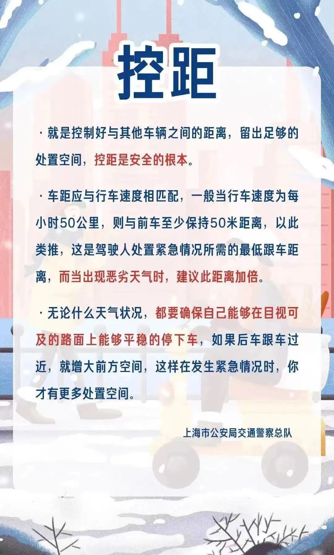 冬季冰雪路面应保持在其他季节干燥路面 2至3 倍的安全距离,与前车留出充分的制动距离,保证驾驶安全。