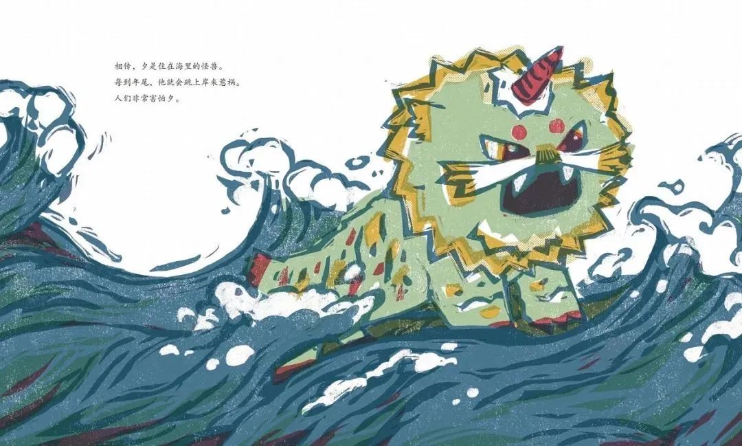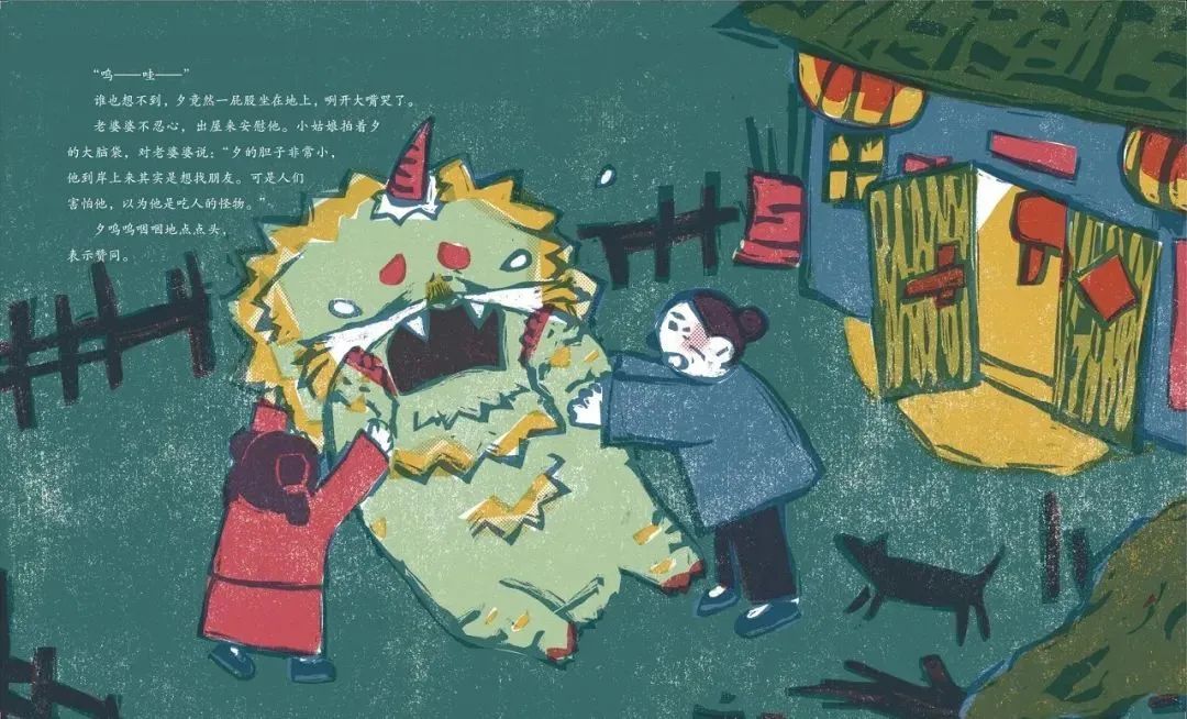 作者反其道而行之,将夕设计成外形高大、可怕,但内心却住着一个孤独胆小、渴望伙伴的小孩的海兽。在这个全新的《除夕》故事里,来历神秘的红衣小姑娘把夕介绍给桃花村的村民,大家破除了之前想象中的恐惧,接纳了可爱的“海兽”夕,从此,原本令人恐惧的除夕夜变成了热闹欢乐的吉祥年。