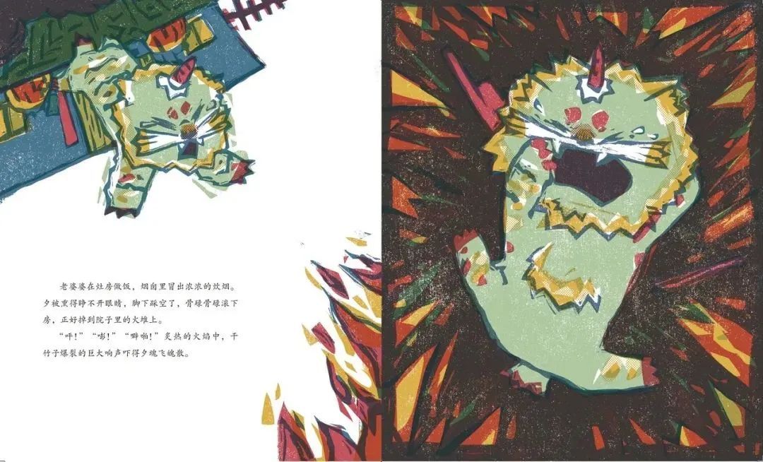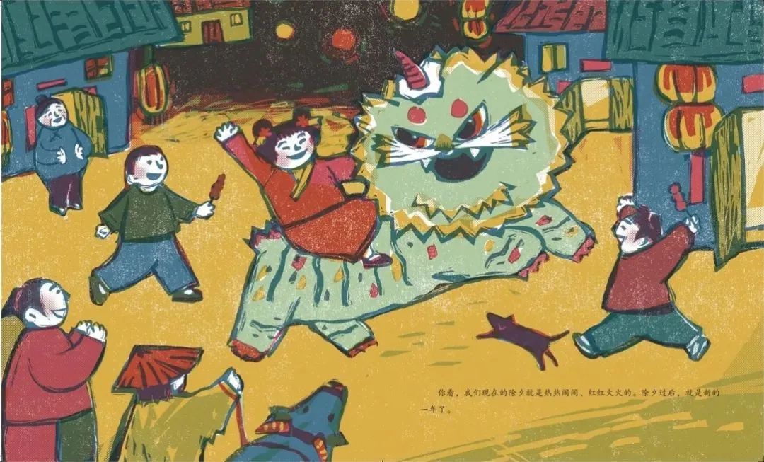 以《除夕》为例,在传统的故事中,夕是一个恐怖的兽,人们在年终岁尾,会通过放鞭炮、贴对联、挂红灯笼来驱赶它,以免其祸害人间,体现的是一种不友好的对立关系。