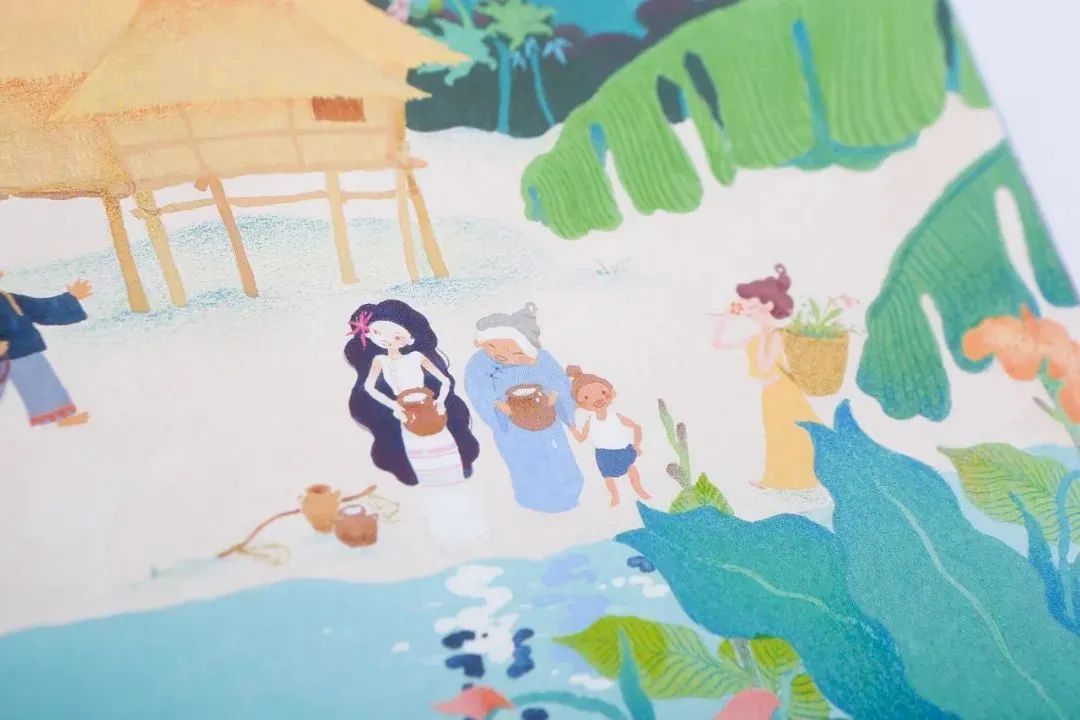 经过反复打样对比,我们最终选择了150g超滑纯质纸,更好地还原原画细腻的纹理。这套《中国节:我们的传统节日故事》中,有近一半的作品是手绘原画,经过扫描、调色、电脑处理等一系列操作才呈现出眼前的效果。