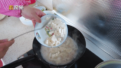 4.水开加入豆腐,再淋入适量淀粉水增稠