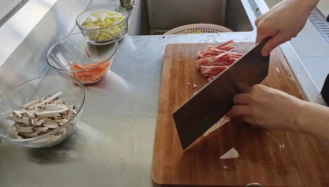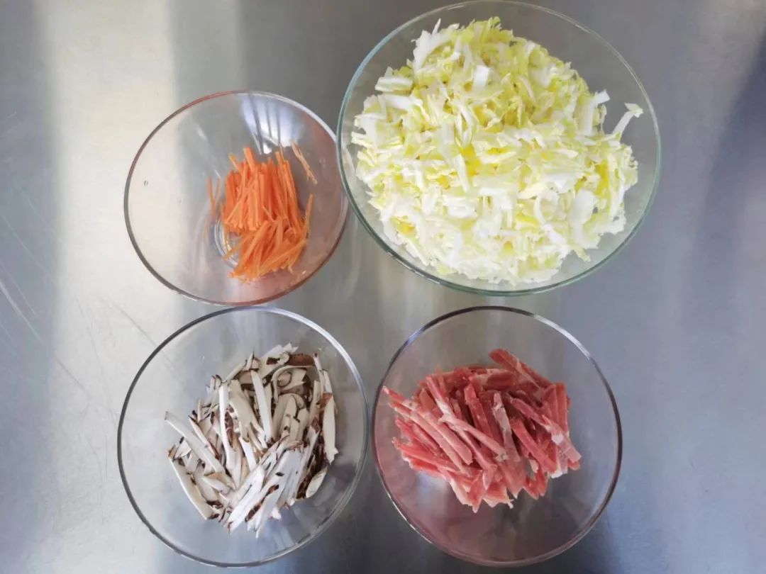 1.白菜、香菇、猪瘦肉、胡萝卜洗干净、沥干水份之后,切成丝。胡萝卜仅用于点缀馅料,只需要少量即可。三丝里加入胡萝卜之后,口感更为香甜,馅料的颜色更加好看,也更能增强食欲。