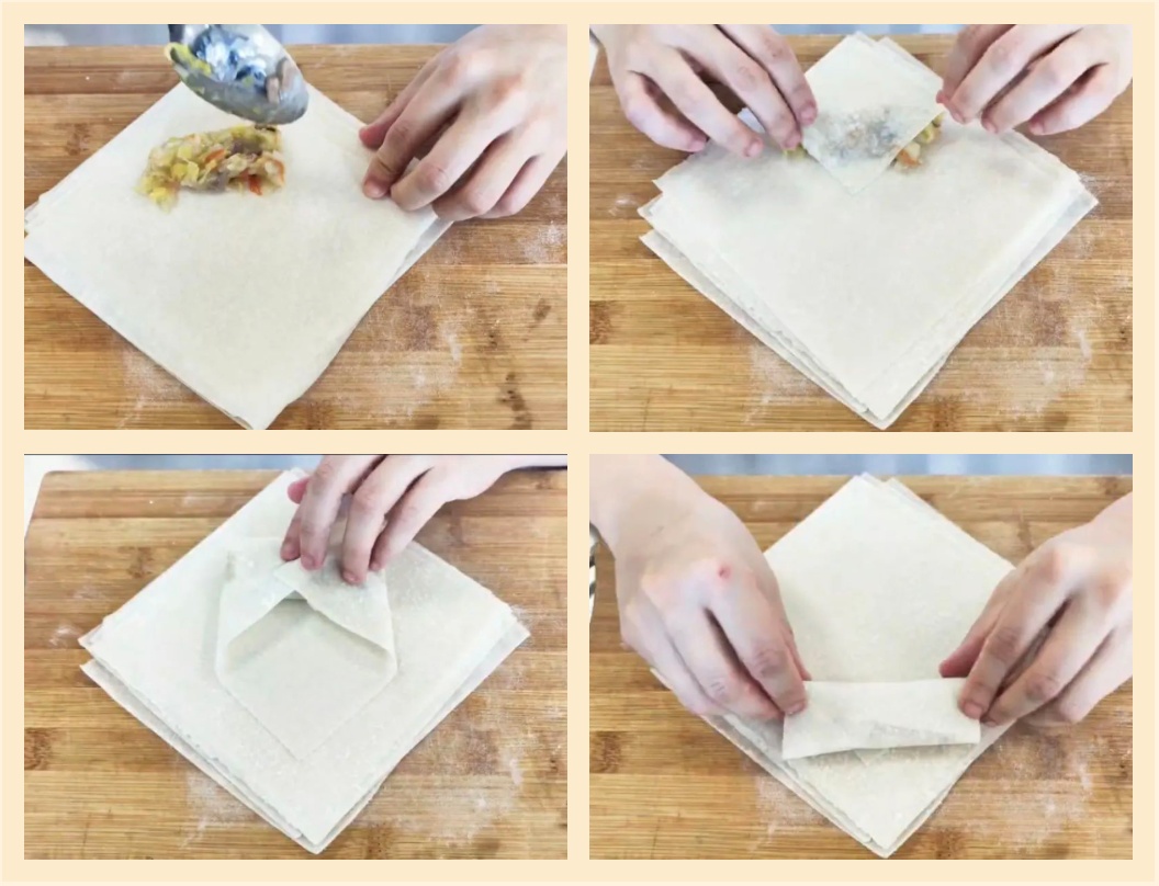 4.馅料晾凉后,开始包制春卷。