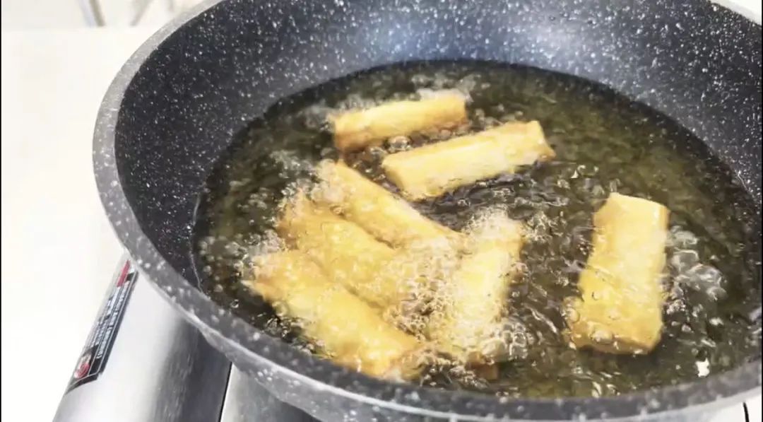 4、不粘锅中加入食用油后加热,将一根筷子放进油中,油锅里冒出密集的小气泡后,就可以把包好的春卷放入油中煎炸。春卷炸成金黄色后即可捞出、装盘,三丝春卷便完成啦。