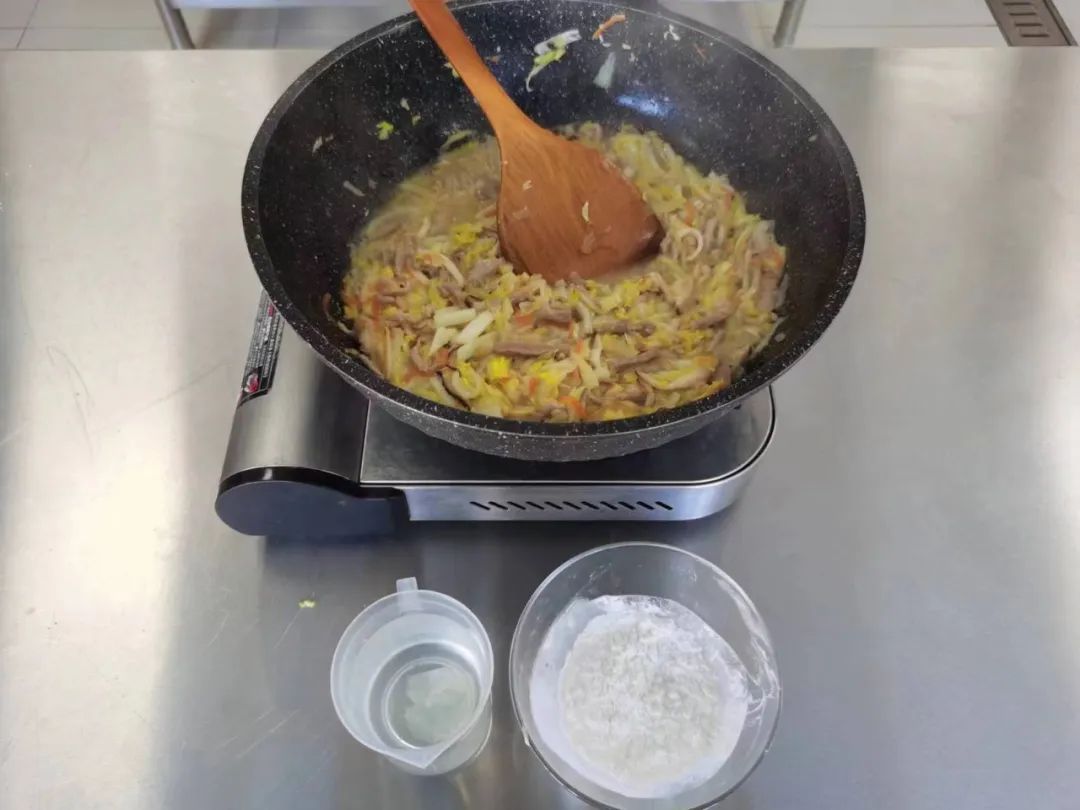 5.凉水勾芡,搅拌均匀后快速倒入锅中翻炒,馅料紧紧粘在一起后便可盛出。
