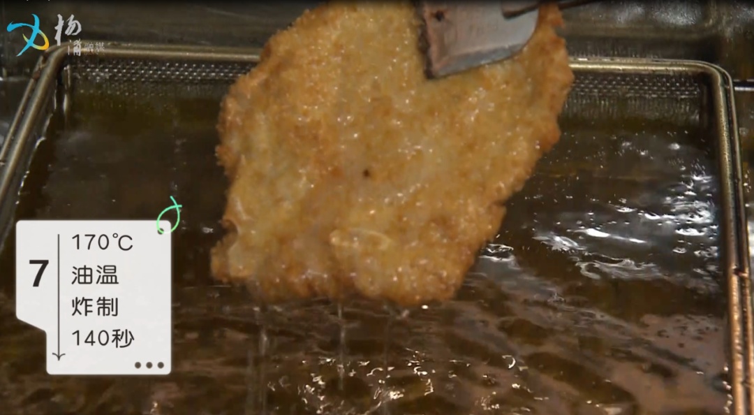 第四步 :油温170℃下锅炸制140秒,猪排呈现两面金黄后出锅。