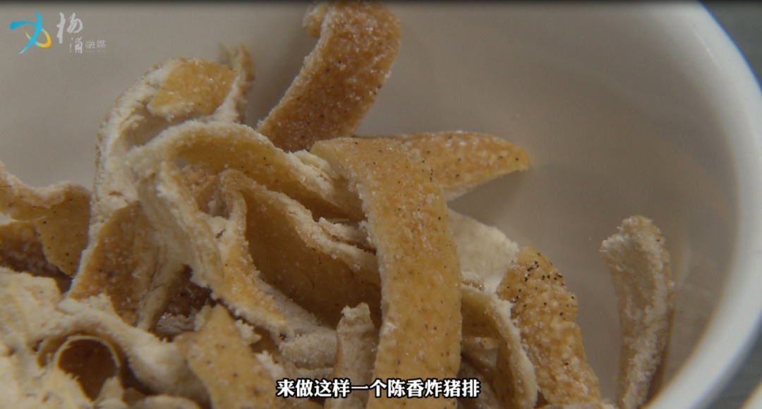 第三步 :冷藏猪排取出,加入生粉上浆,抓拌有粘性后加入陈皮碎再次腌制,再次放入冰箱冷藏5个小时。