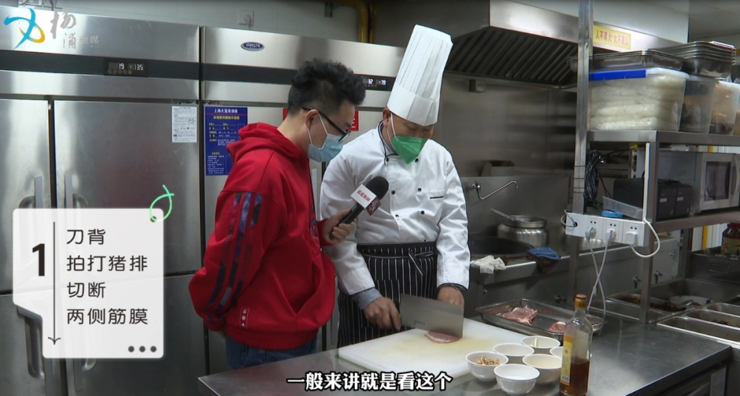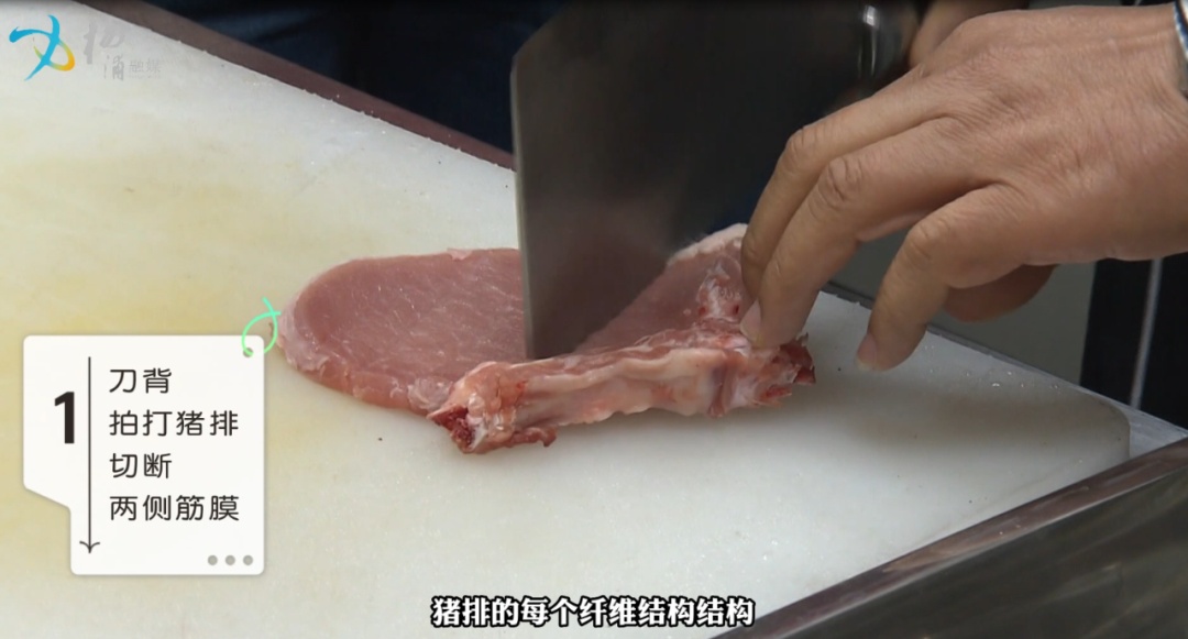 第一步 :用刀背把猪排拍软,让猪排的肌肉纤维软化,切断两边筋膜,防止炸制时猪排蜷缩。