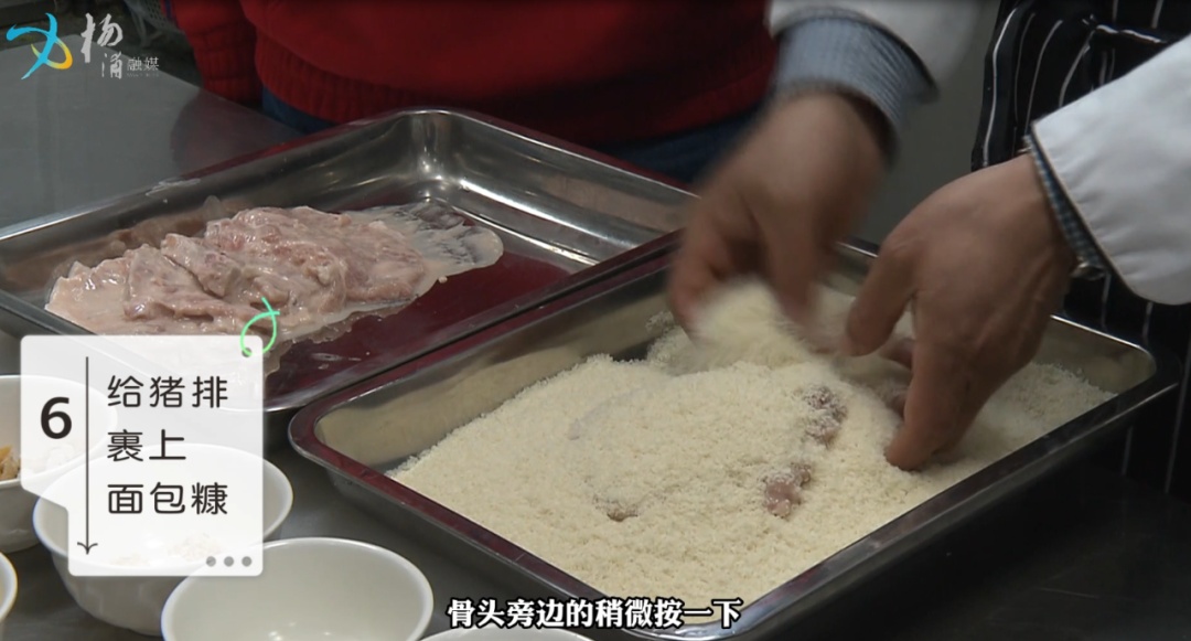 第四步 :腌制好的猪排,均匀裹上面包糠。
