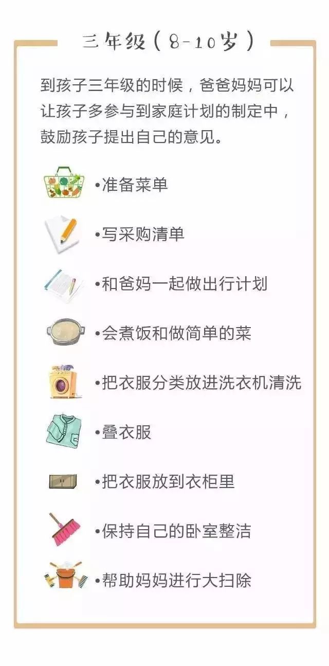 对照下面的家务年龄表,父母可以更好地把握什么年龄的孩子该做哪些家务。