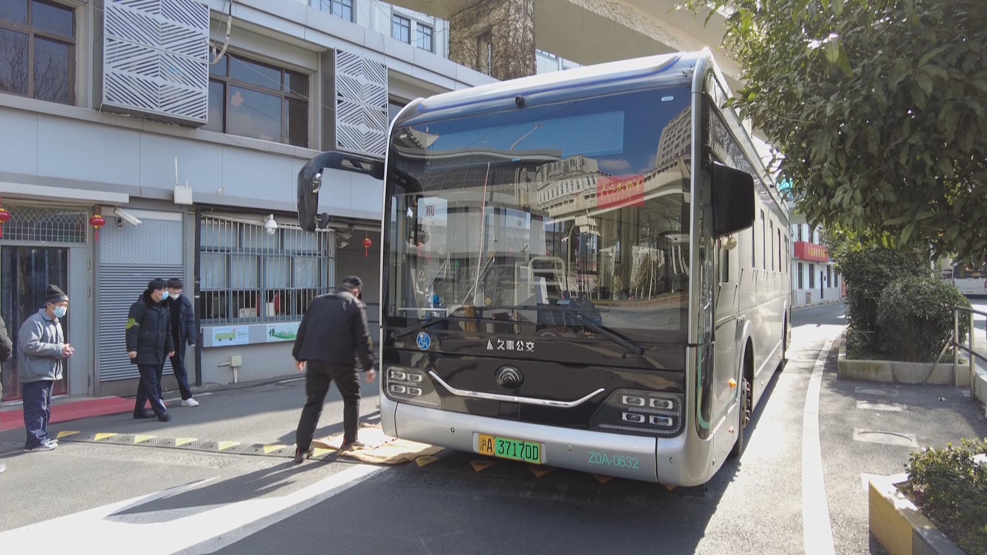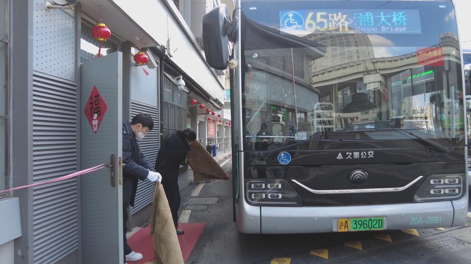 “铺了麻袋挺好的,不太容易滑,也方便我们上下车。”乘坐65路前往外滩游玩的张阿婆说。