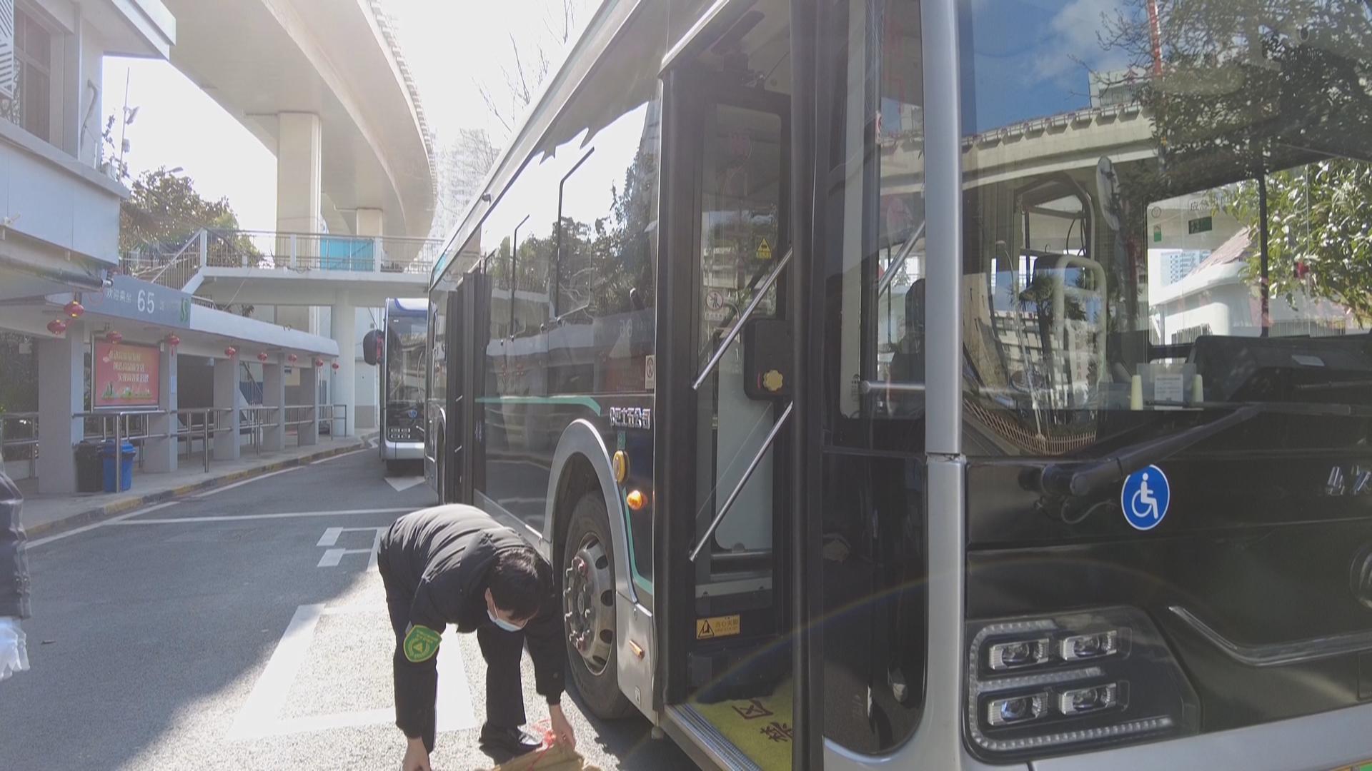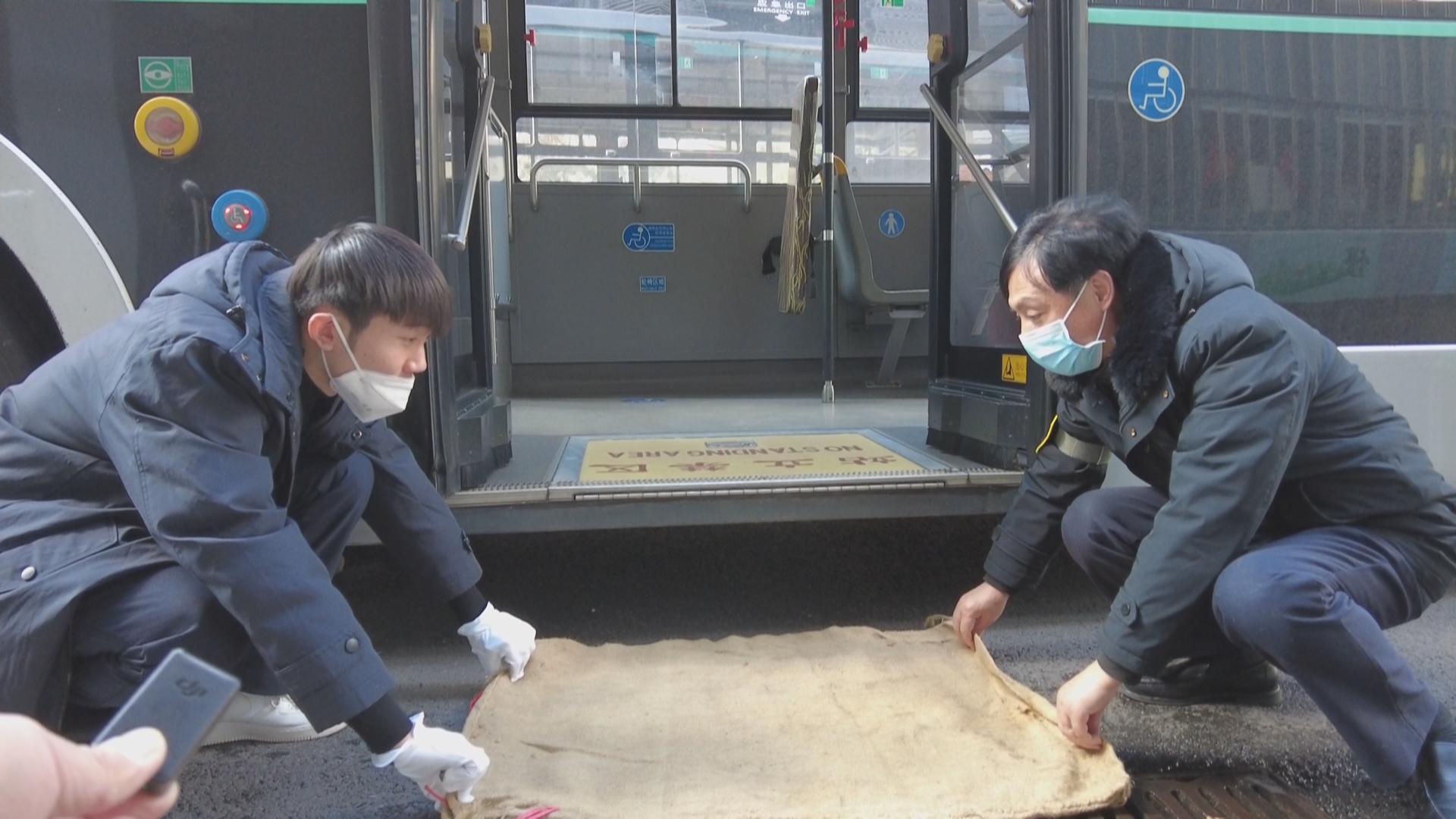 “今天早上看到有轻微的结冰现象,所以我们马上把准备好的麻袋铺在上下客的车门的地方,防止乘客摔倒。后面还会继续降温,这个工作我们还会继续做,并提醒乘客上下车的时候要小心。” 65路行管员张澄宇告诉记者。