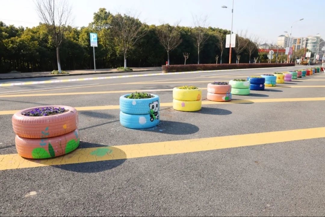 值得一提的是,这里还是一个青年广场,三个框型电子屏上滚动播放着各种青春口号。不远处的金山区第一实验小学门口,原本的三角锥形路标被换成了五彩缤纷的轮胎路障,两个轮胎一组,上方种有时令花卉,轮胎上还进行了各式彩绘。据悉,前不久,朱泾镇成功入选了“上海市青年发展型街镇”建设试点名单,街头满满的青年元素让人感受到朱泾的青春活力。