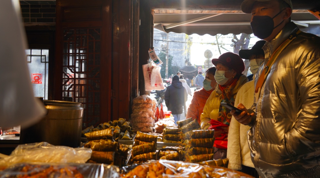 对于市民来说,出门逛逛古镇、看看灯展、品尝美食是非常惬意的一件事情。来自江苏的张小姐与朋友一到古镇,直接开启“边吃边逛”的游览模式,烧卖、海棠糕、萝卜丝饼统统购买在内。而从浙江自驾过来的王老伯一落地就赶去预约好的店铺排队取粽子:“吃惯了这一家,每年都要买上几十只,除了自己吃还要送送亲戚朋友。”