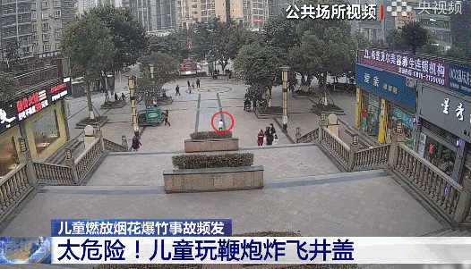 一个小孩将点燃的爆竹扔进窨井盖中,