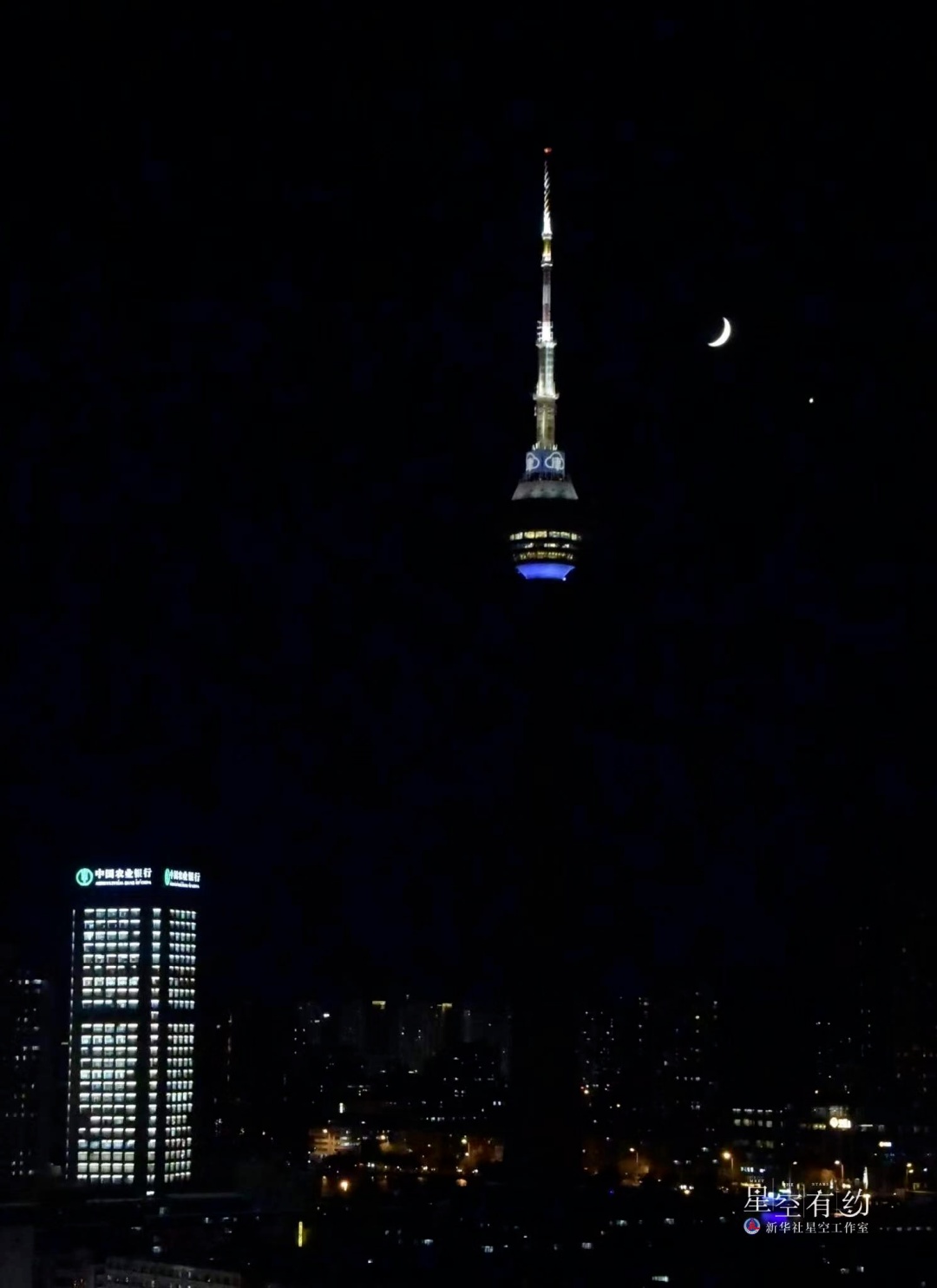 修立鹏介绍说,在蓝色天幕的映衬下,这幕星月相伴的浪漫一幕清晰度极高,抬头即可看到,观赏效果非常好。“除了用肉眼欣赏外,喜欢天体摄影的朋友可以将二者‘同框’拍下。”