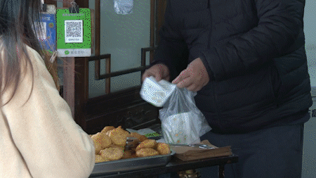 老街弄堂里的一家小吃店门口,逐渐排起了队伍,原来,这里正在卖奉贤塌饼。记者也忍不住买了几个尝尝,金黄饱满、色泽鲜艳的塌饼吃起来外脆里糯,十分可口。据说,“塌饼”有“太平”的谐音,寓意“太太平平”。路妈妈小吃店老板李先生介绍道“因为春节了嘛,每天游客也比较多,我们每天早上很早就起来准备。这是我们奉贤特色的本地塌饼,从小爸爸妈妈做给我们吃,现在过年嘛,吃一吃金黄色的塌饼,大家都觉得比较红火。”