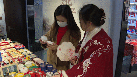 走进老街,便看到街上人头攒动,一片欢腾热闹的氛围。记者走进位于老街入口处的贞格格杂货铺,开始挑选起汉服、试起各种珍珠膏来。贞格格胭脂铺青溪老街店店员王媛媛热情地向记者介绍:“这两天顾客也很多,大家都非常开心,在店里总能看到大家洋溢的笑容。因为我们店在青溪老街,美丽的景色也很多,一些喜欢汉文化的朋友会选这些服装,穿上后在外面拍照。