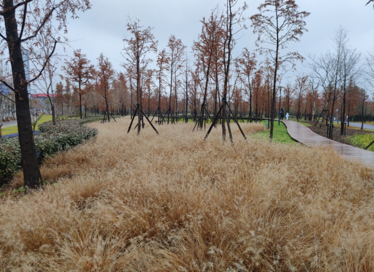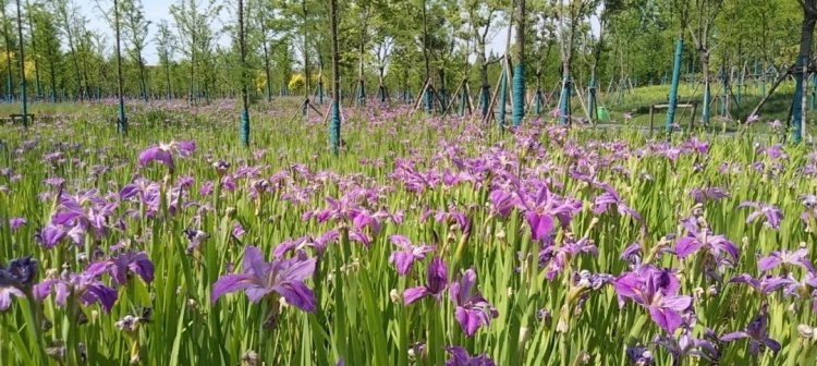 公园充分利用现有地形景观,在园内步道的东西两侧籽播春秋两季花种,形成约5万平方米的花海区域供游人欣赏。除此之外,园内在西侧木栈道两侧种植了路易斯安娜鸢尾,5月可以看到盛开的蓝紫色鸢尾花,搭配在鸢尾花中的落羽杉作为背景,让市民游客仿佛置身于花海当中。